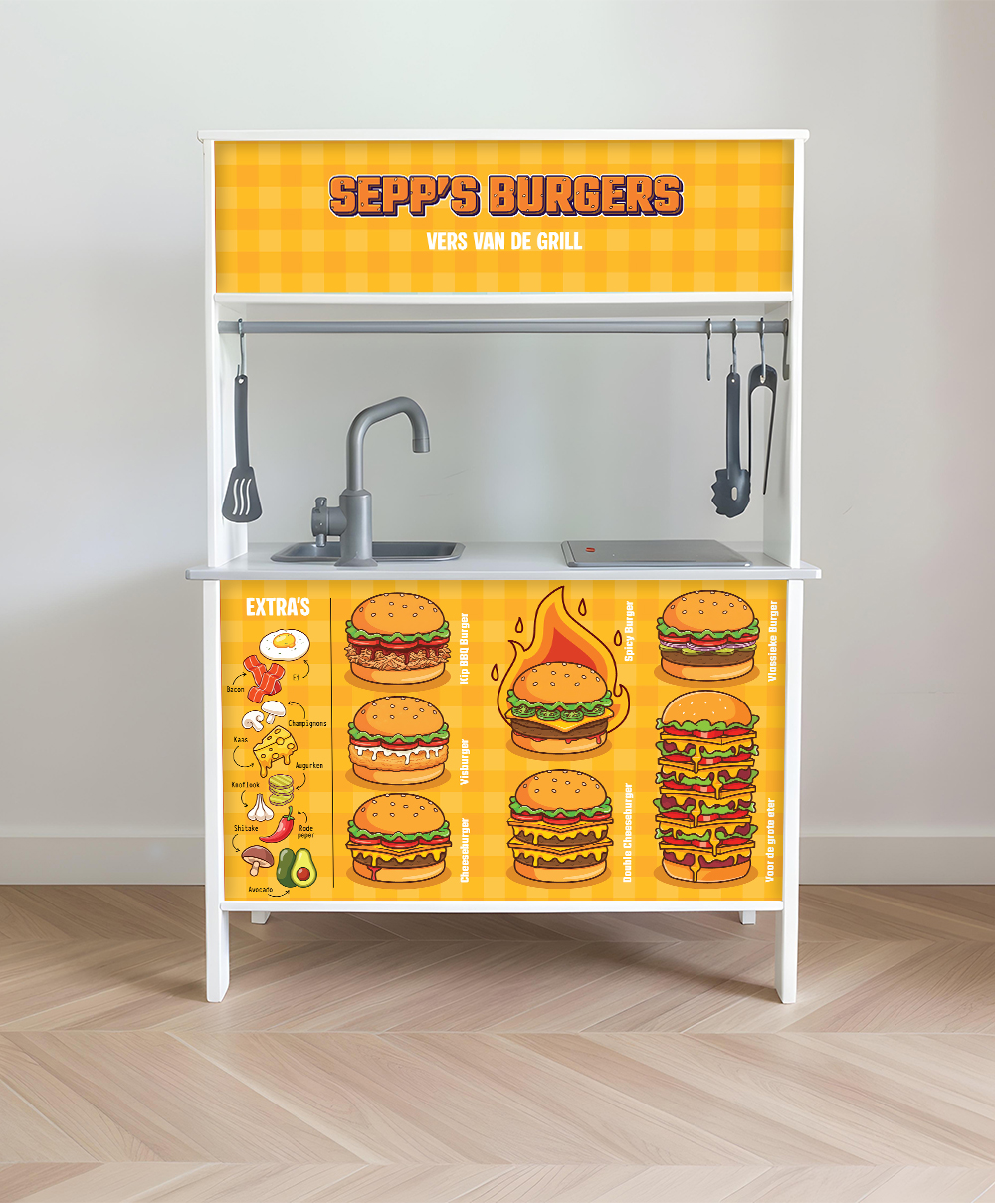 Tover je IKEA Duktig speelkeuken om in een gezellig hamburgerkraam Met deze vrolijke sticker set krijgt het speelkeukentje een uitnodigende uitstraling en verandert het in een kraampje waar kinderen hun eigen hamburgers kunnen bereiden en verkopen. Perfect voor urenlang speelplezier!