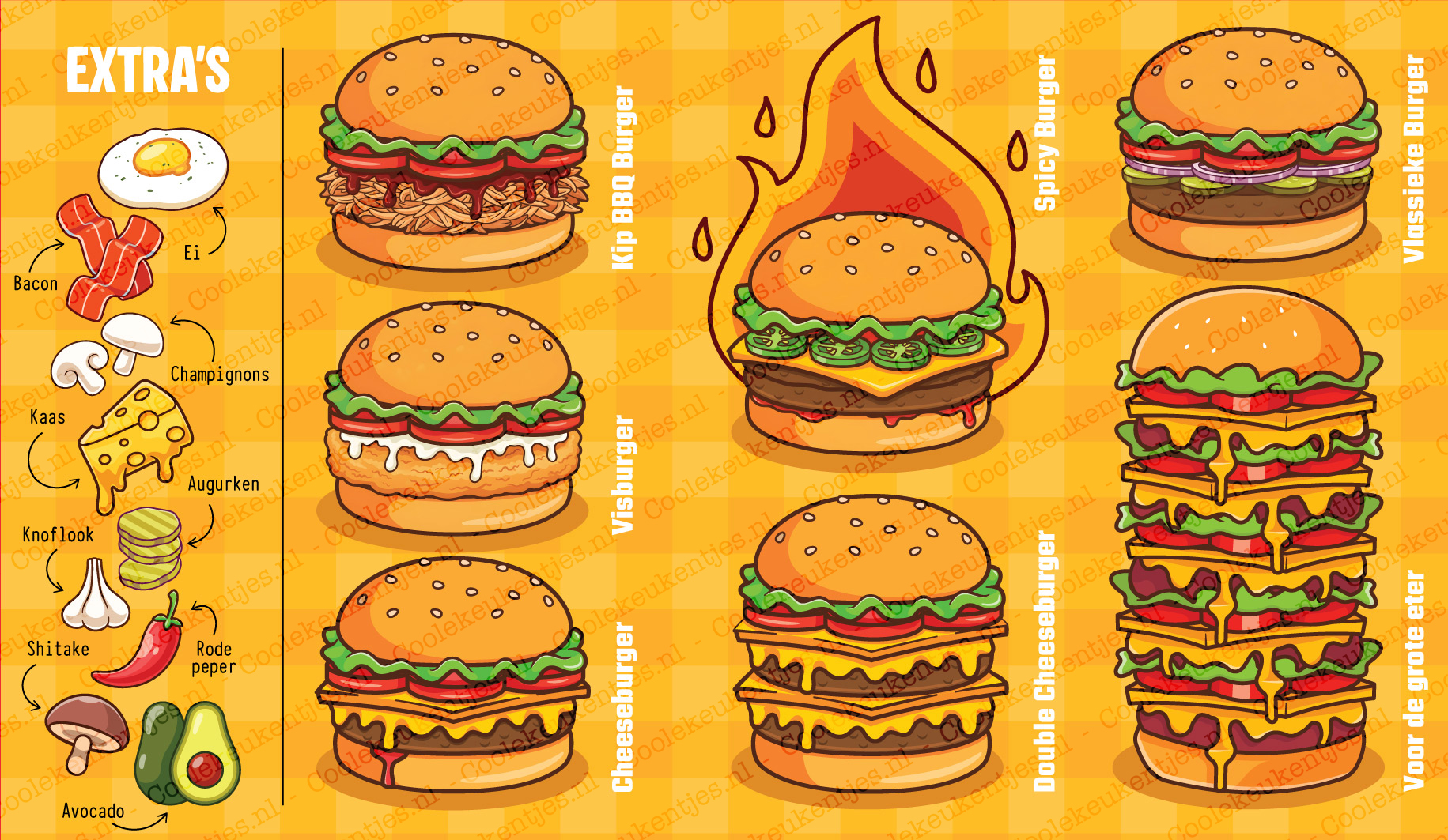 - Vrolijk en kleurrijk ontwerp met hamburgers en bijpassende details