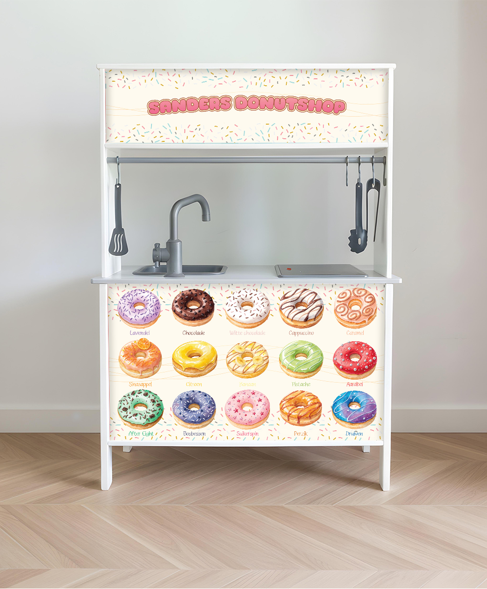 Tover je IKEA Duktig speelkeuken om in een vrolijke donutshop! Met deze kleurrijke sticker set krijgt het speelkeukentje een uitnodigende en speelse uitstraling. Kinderen kunnen hun eigen donuts ‘bakken’ en verkopen en volop fantasierijk winkeltje spelen. Perfect voor urenlang speelplezier!