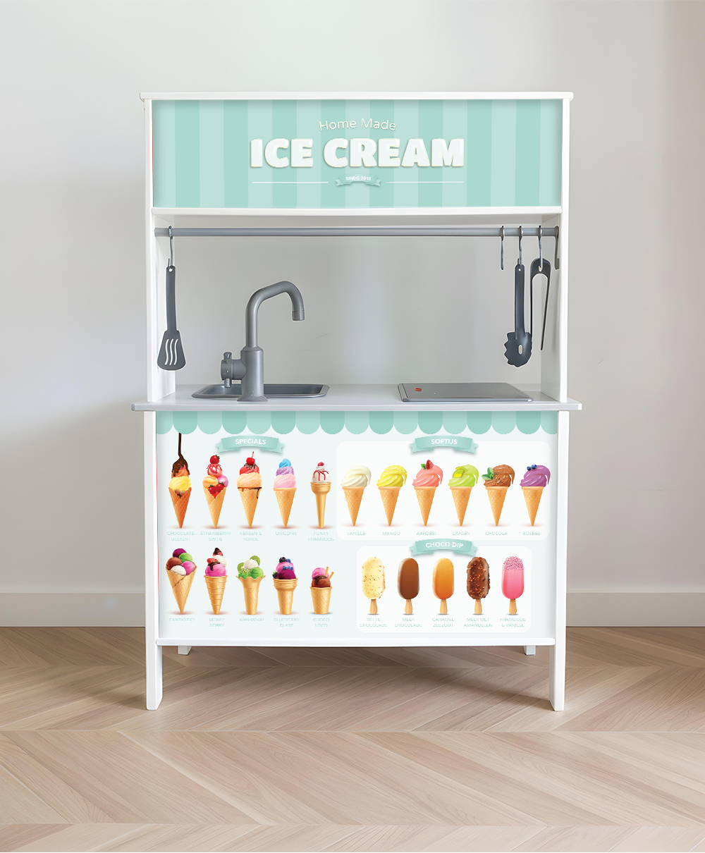 Tover je IKEA Duktig speelkeuken om in een vrolijke ijswinkel! Met deze kleurrijke, blauwgroene sticker set krijgt het speelkeukentje een uitnodigende en speelse uitstraling. Kinderen kunnen hun eigen ijsjes verkopen en volop fantasierijk winkeltje spelen. Perfect voor urenlang speelplezier!