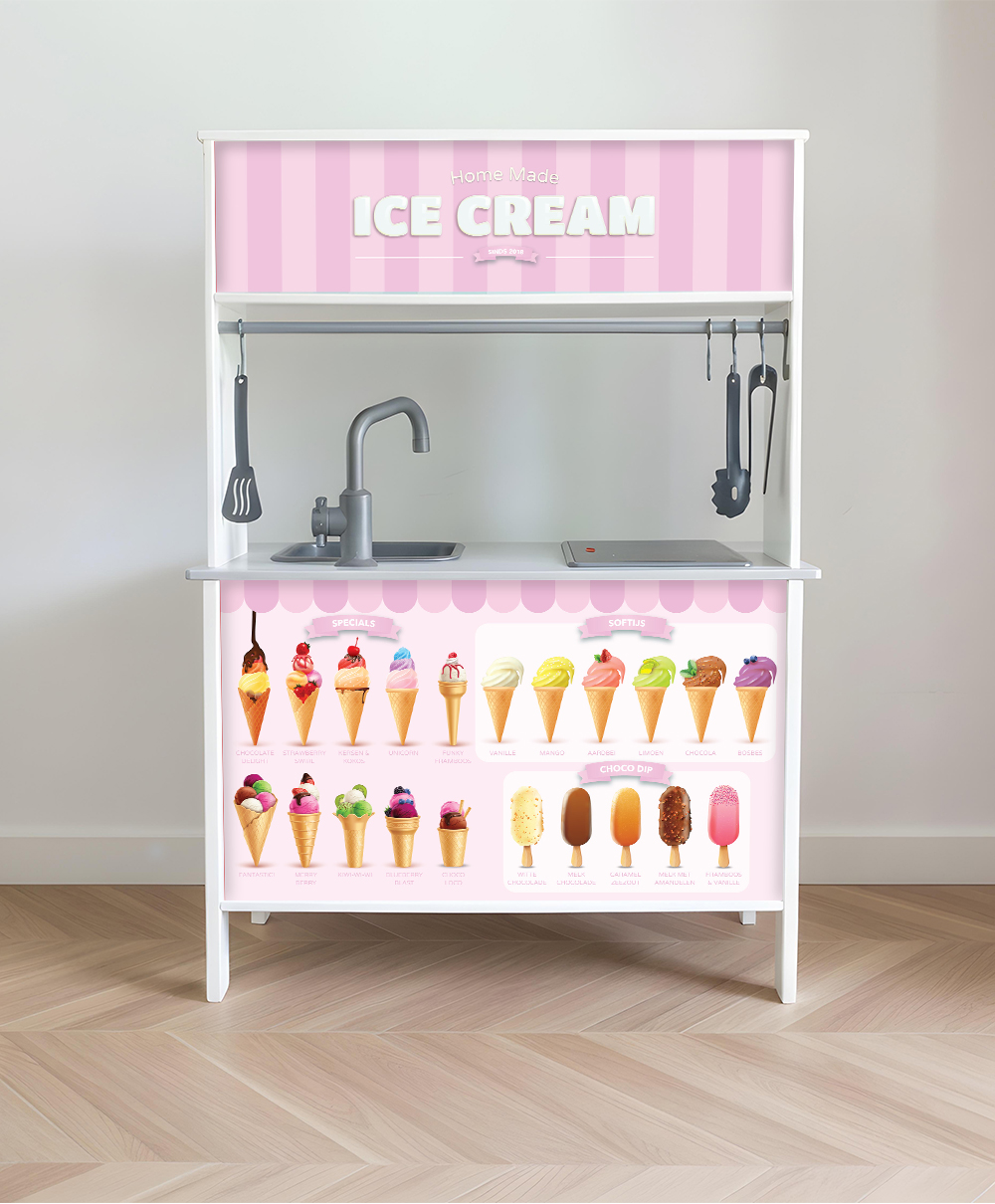Tover je IKEA Duktig speelkeuken om in een vrolijke ijswinkel! Met deze kleurrijke, roze sticker set krijgt het speelkeukentje een uitnodigende en speelse uitstraling. Kinderen kunnen hun eigen ijsjes verkopen en volop fantasierijk winkeltje spelen. Perfect voor urenlang speelplezier!