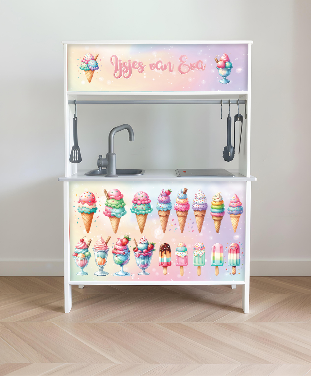 Tover je IKEA Duktig speelkeuken om in een vrolijk ijskraampje! Met deze kleurrijke sticker set krijgt het speelkeukentje een uitnodigende en speelse uitstraling. Kinderen kunnen hun eigen ijsjes verkopen en volop fantasierijk winkeltje spelen. Perfect voor urenlang speelplezier!