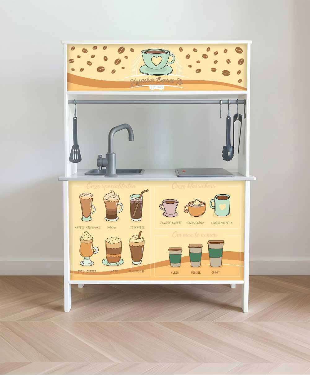 Tover je IKEA Duktig speelkeuken om in een gezellig koffiekraampje! Met deze leuke sticker set krijgt het speelkeukentje een warme en uitnodigende uitstraling. Kinderen kunnen eindeloos rollenspellen spelen als barista of verkoper in hun eigen kraampje. Perfect voor urenlang speelplezier!