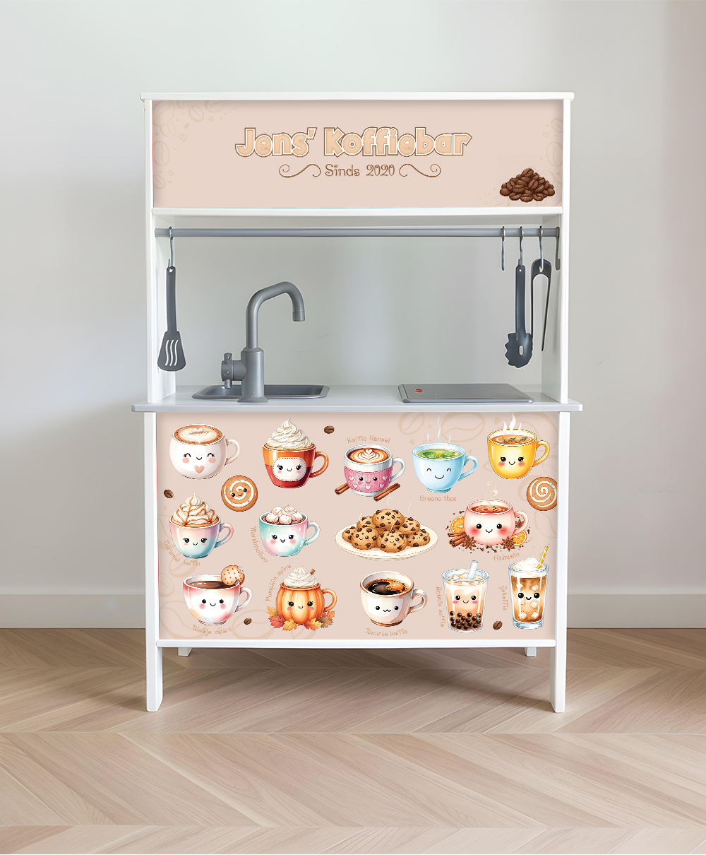 Tover je IKEA Duktig speelkeuken om in een schattig koffiebar! Met deze kawaii sticker set krijgt het speelkeukentje een vrolijke en unieke uitstraling. Kinderen kunnen eindeloos rollenspellen spelen als barista of verkoper en hun eigen koffiehoek runnen. Perfect voor urenlang speelplezier!