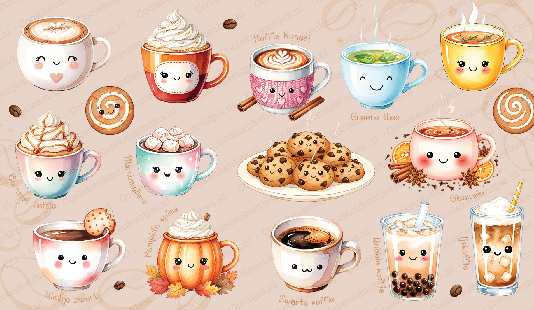 - Schattig kawaii ontwerp met koffie-elementen en vrolijke details